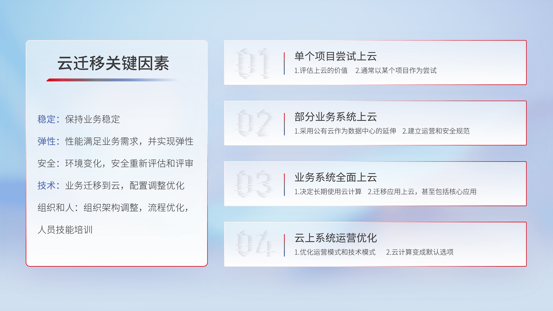 结合实际业务,,,从规划设计、、、云平台选型、、云原生改造、、数据迁移、、、集成交付,,,,迁移全过程为客户识别最佳上云路径,,,做好风险识别管理,,,,设计网络架构、、、身份权限、、安全审计合规、、、、操作审计、、、、日志审计、、、监控告警策略、、、多站点容灾设计等,,对云上基础设施进行整体规划,,提升IT治理水平,,,,以满足弹性、、高可用、、高性能的需求。。。